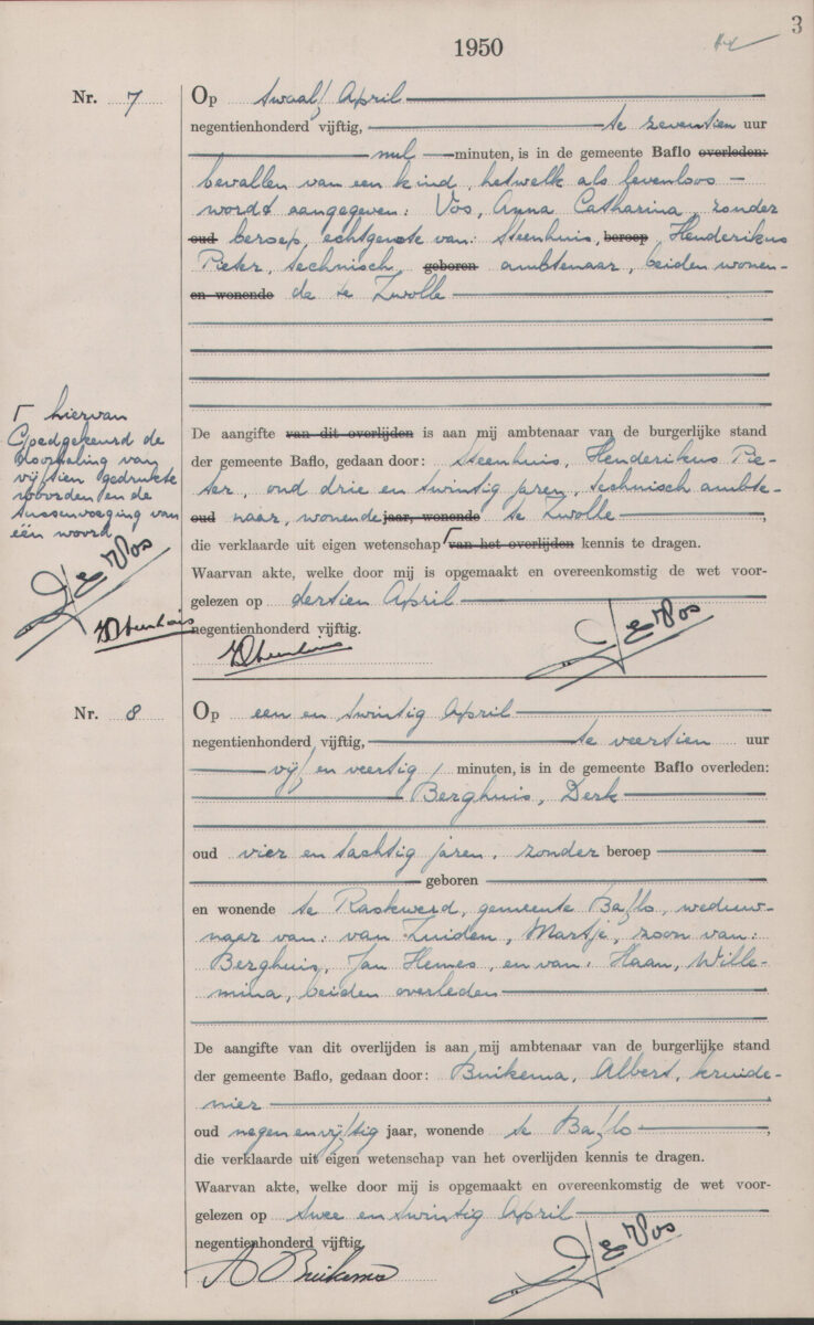 “Overlijdensakte,” 22-04-1950, Gemeente Baflo, Periode 1950, Overlijdensregister 1950, archiefnummer 1623, inventarisnummer 1210, Aktenummer 8, Groninger Archieven, allegroningers.nl, Scan akte.