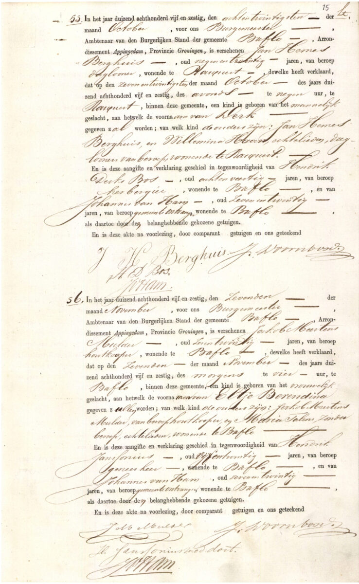 “Geboorteakte,” 28-10-1865, Gemeente Baflo, Periode 1865, Geboorteregister 1865, archiefnummer 1623, Aktenummer 55, Groninger Archieven, allegroningers.nl, Scan akte.